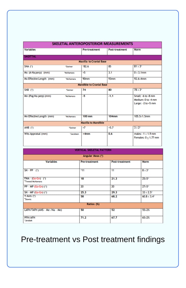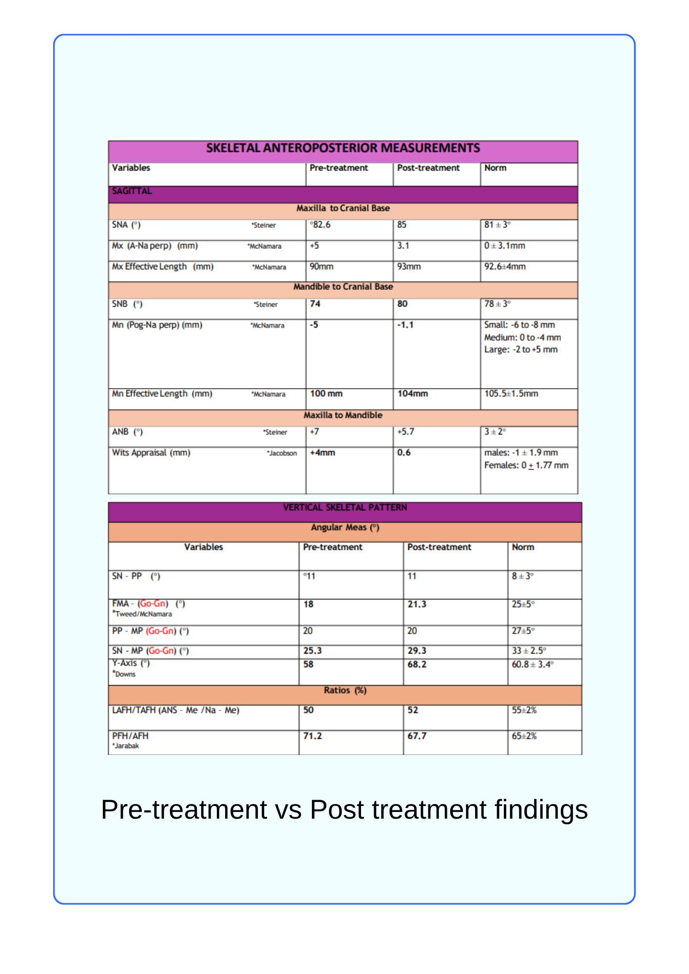 The cephalometric findings reveal significant skeletal, dental, and soft tissue improvements. Skeletally, the maxilla showed forward movement, with SNA increasing from 82.6° to 85° and A-Na perpendicular decreasing from +5 mm to 3.1 mm, indicating a shift toward normal.