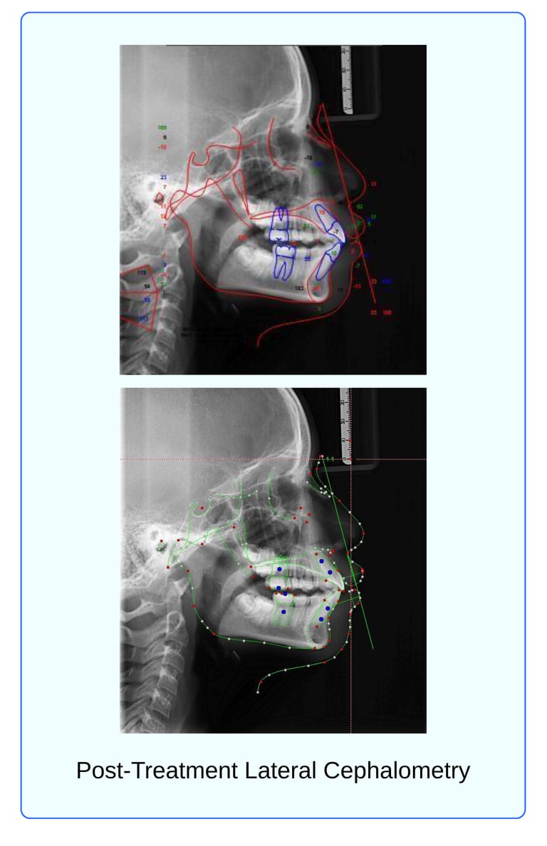 Soft tissue analysis showed a more harmonious facial profile, with facial convexity decreasing from 16° to 12.8°. The nasolabial angle remained unchanged at 80°, still below the ideal range. Both upper and lower lips became less protrusive relative to the E-plane, reducing from +3.4 mm to +2.6 mm. Overall, the changes reflect significant skeletal advancement, dental compensation, and profile improvement