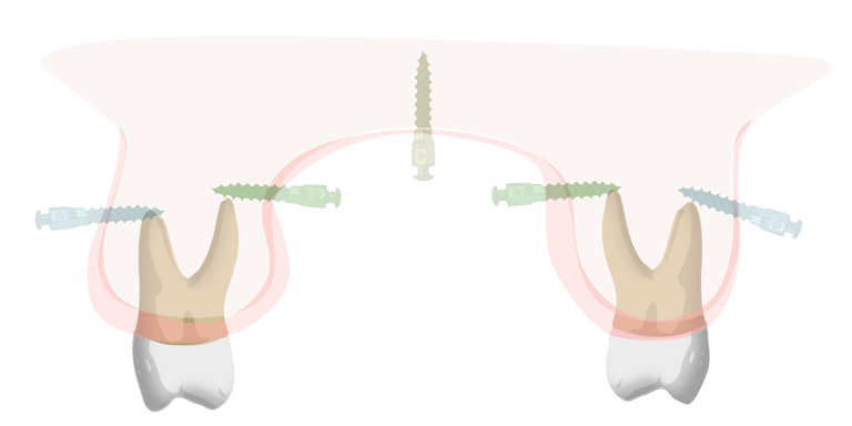 The TAD should be positioned sufficiently high to generate an intruding force with an extended range of action. However, the buccal attached gingiva in the region of the maxillary first and second molars is often too narrow to allow for high placement. Tae Kim Woo recommended using a single mid-palatal TAD combined with a TPA, as this provides a longer lever arm and is a more cost-effective option.